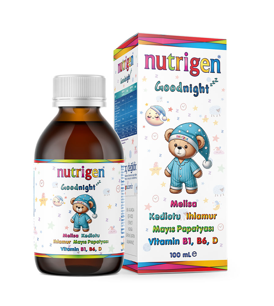 Nutrigen Goodnight Melisa, Mayıs Papatyası, Kediotu, Ihlamur ve Vitamin İçeren Takviye Edici Gıda, 4-10 yaş grubu çocukların, 11 yaş ve üzeri yetişkinlerin kullanımına uygundur. Parti no, üretim tarihi ve son tüketim tarihi kutunun altındadır. Çocukların ulaşamayacakları yerlerde, ambalajı içerisinde ve 25˚C altındaki oda sıcaklığında saklayınız.
