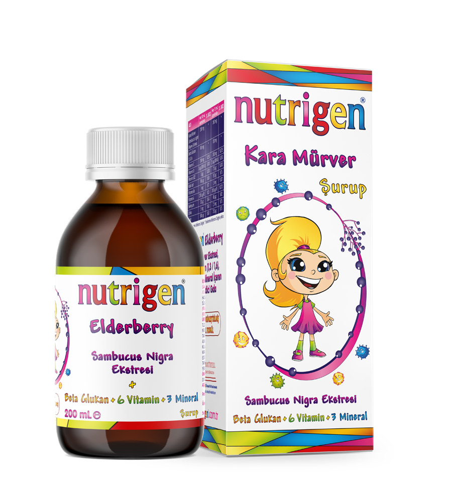 Nutrigen Kara Mürver Şurup kara mürver meyve ekstresi, beta glukan, vitamin C, vitamin D, vitamin A, vitamin B6, vitamin B12, folik asit, çinko, selenyum ve bakır ile güçlendirilmiş takviye edici gıdadır. Bal ile özel olarak formüle edilmiştir. Tatlandırıcı, Renklendirici ve Koruyucu içermez.