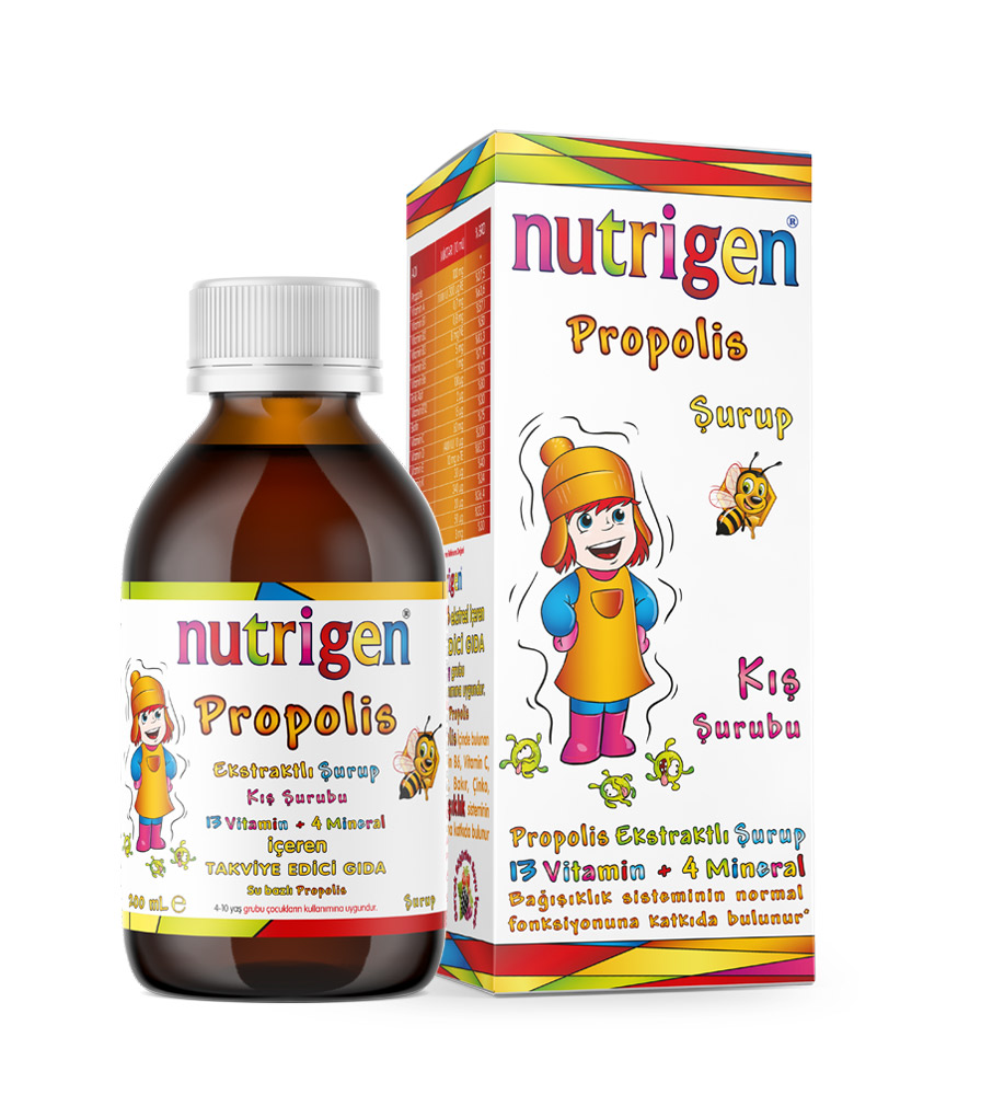 Nutrigen Propolis Şurup propolis ekstresi ile güçlendirilmiş takviye edici gıdadır. Nutrigen Propolis çocukların günlük olarak alması gerekli Vitamin A, B grubu Vitaminleri (Folik asit dahil), Vitamin C, Vitamin D, Vitamin E, Vitamin K, Bakır, Selenyum, İyot ve Çinko ile zenginleştirilmiştir.